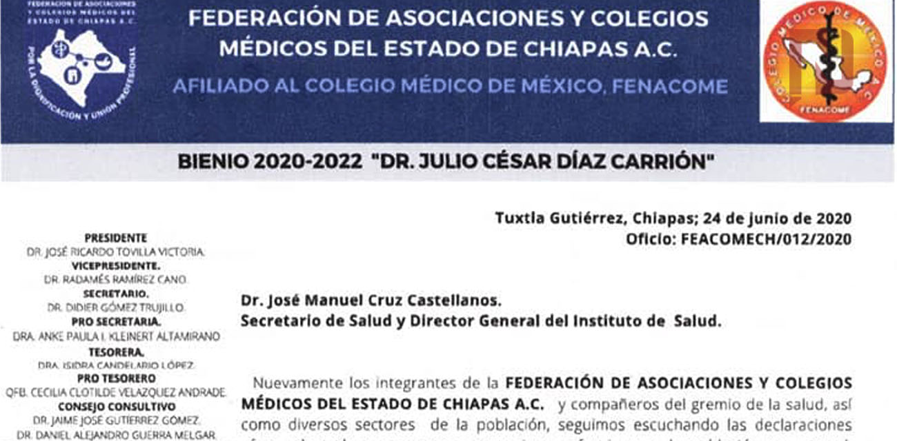 Mediante oficios dirigidos al gobernador de Chiapas, Rutilio Escandón Cadenas, y al Secretario de Salud, José Manuel Cruz Castellanos, la Federación de Asociaciones y Colegios de Médicos del Estado de Chiapas hizo un llamado a las autoridades a reconsiderar la reapertura de actividades no esenciales, pues aseguraron que la entidad se encuentra en el peor punto de la pandemia.