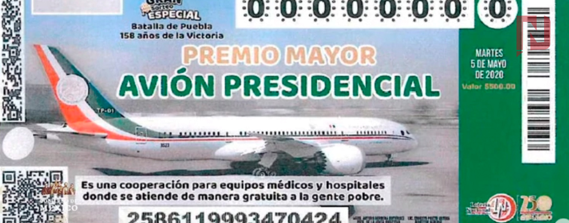 El presidente Andrés Manuel López Obrador presentó este martes el diseño del ‘cachito’ de la Lotería Nacional que se imprimiría en caso de que el Gobierno rife el avión presidencial.