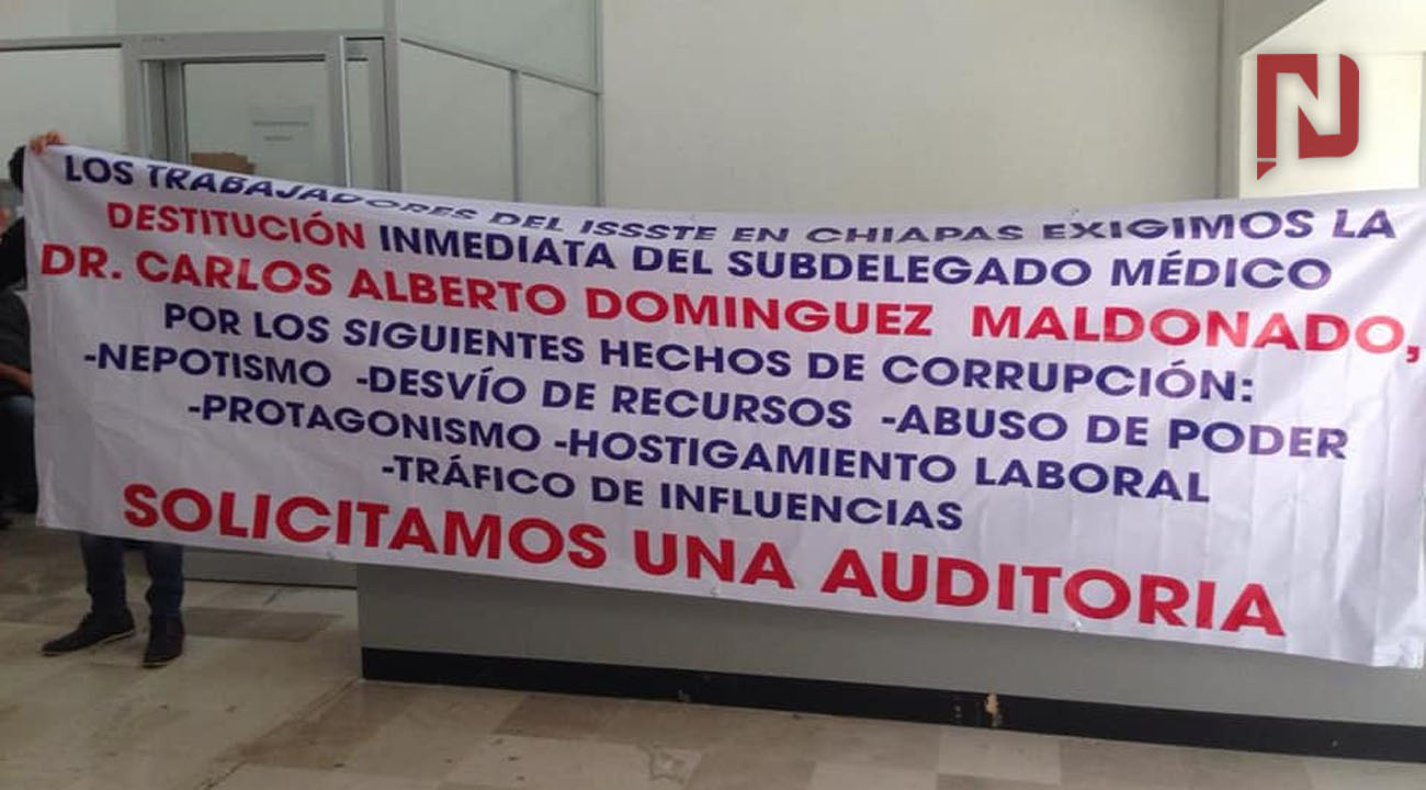 Trabajadores del Instituto de Seguridad y Servicios Sociales de los Trabajadores del Estado (ISSSTE) en Chiapas denunciaron presuntos actos de corrupción realizados por el subdelegado médico, Carlos Alberto Domínguez Maldonado, ante lo que solicitaron un inmediata destitución.