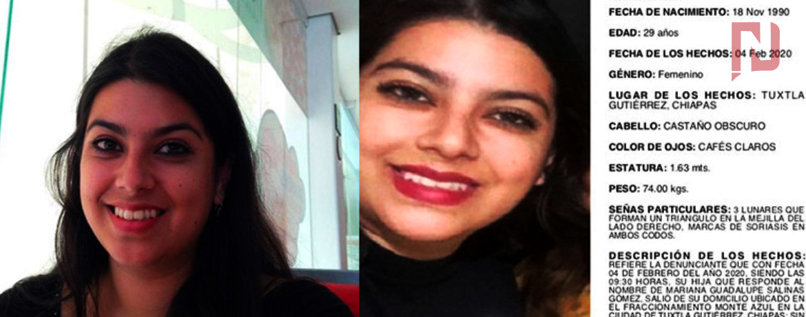 Mariana Guadalupe Salinas Gómez, quien se desempeña como trabajadora de diferentes medios estatales y nacionales en los últimos años, desapareció el pasado 4 de febrero a las 9:30 horas, su madre comentó que salió de su domicilio en el Fraccionamiento “Monte Azul” en Tuxtla Gutiérrez, sin embargo no regresó a su casa.