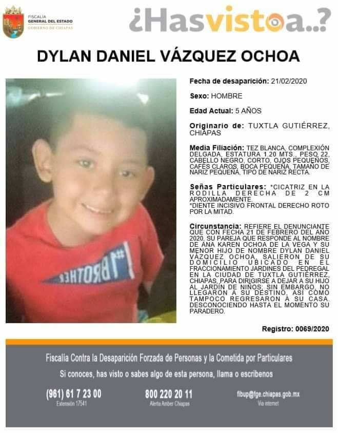 Con base en la ficha de desaparición 0069/2020 emitida por la Fiscalía General del Estado de Chiapas, la mujer salió de su domicilio ubicado en el Fraccionamiento Jardines del Pedregal con rumbo al jardín de Niños de la localidad en la capital chiapaneca.