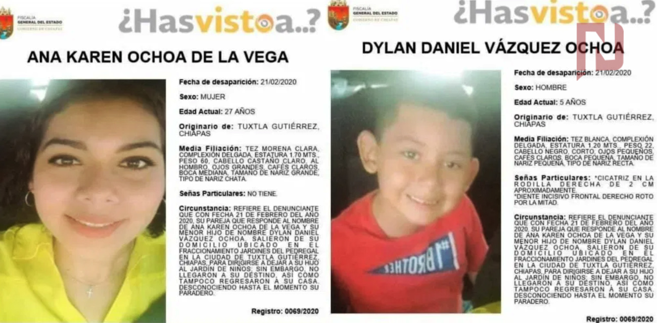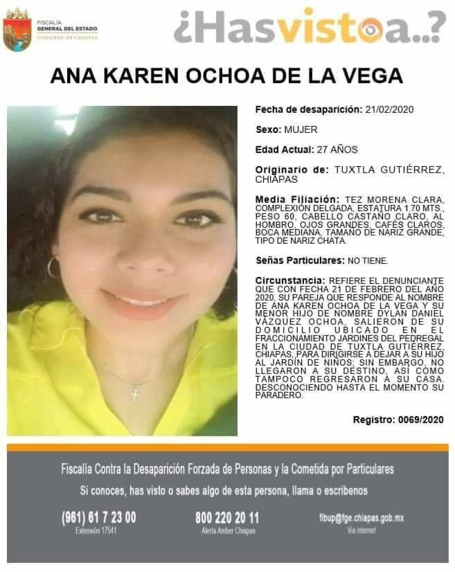 Ana Karen Ochoa de la Vega de 27 años de desapareció el 21 de Febrero del presente año, quien salió de casa para llevar a su hijo Dylan Daniel «N» de 5 años de edad a la escuela como habitualmente lo realizaba, sin embargo ambos ya no llegaron a su destino, por lo cual sus familiares realizaron una alerta de búsqueda.