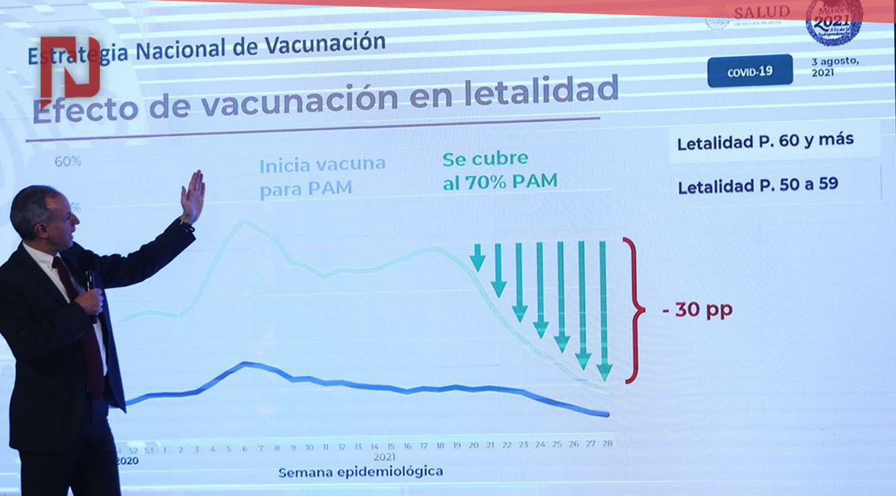 No obstante, a partir de la semana 18, cuando se alcanzó el 70 por ciento de cobertura de la vacunación en población adulta mayor, se redujo la letalidad hasta un 10 por ciento; una reducción de 30 puntos porcentuales. En el grupo de 50 a 59 años también se presentó una reducción semanas después, a partir de la semana 23.