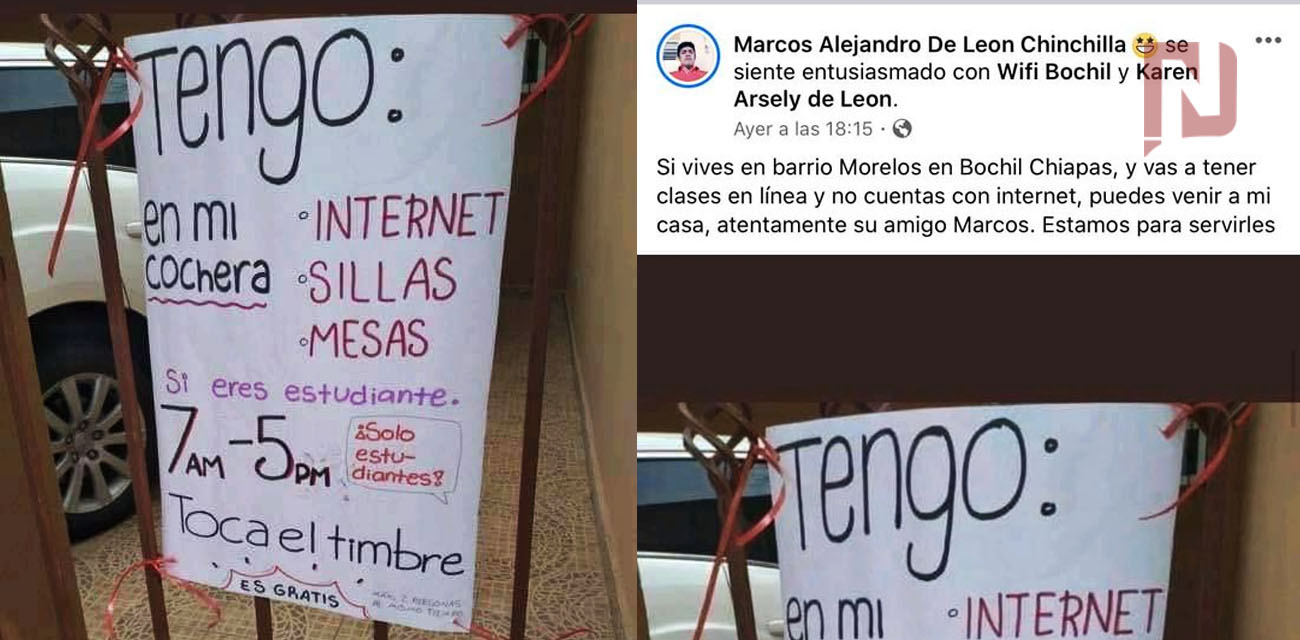 «Si vives en barrio Morelos en Bochil Chiapas, y vas a tener clases en línea y no cuentas con internet, puedes venir a mi casa, atentamente su amigo Marcos. Estamos para servirles», dice su publicación acompañada de la foto de una de las cartulinas colocadas en la puerta de su casa para ofrecer el servicio gratuito.