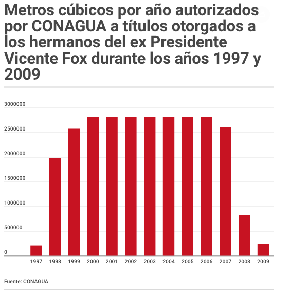 La suma de los permisos de extracción que los Fox mantuvieron vigentes entre el 2000 al 2006 alcanzó los 2 millones 814 mil metros cúbicos anuales y entre los años 1994 y 1999, tuvo un volúmen de descarga permitido por 205 mil 020 metros cúbicos anuales según el título de concesión 08GUA101247/12FMDL14, lo que deja ver los altos niveles de agua que esta empresa requería para su operación.