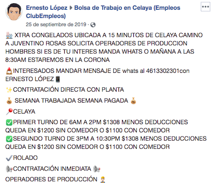 Los jornaleros que se encargan de los cultivos y el proceso de congelamiento son reclutados a través de las redes sociales. Las ofertas de empleo implican salarios de mil 308 pesos semanales menos deducciones para los del primer turno y de mil 308 para el segundo. A este turno les ofrecen la opción de recibir mil 200 pesos sin comedor y mil 100 con comedor.