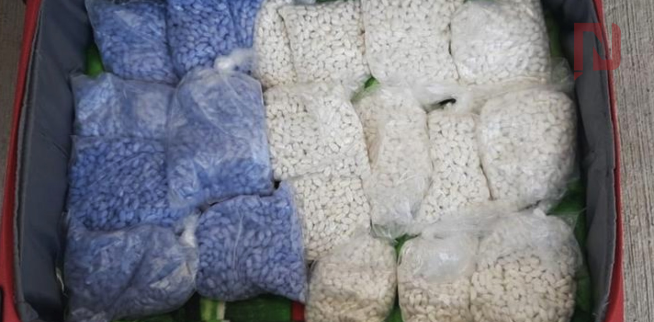 Tras abrir las maletas encontraron pastillas blancas y moradas, así como diez paquetes con marihuana además de las aras y papel moneda.