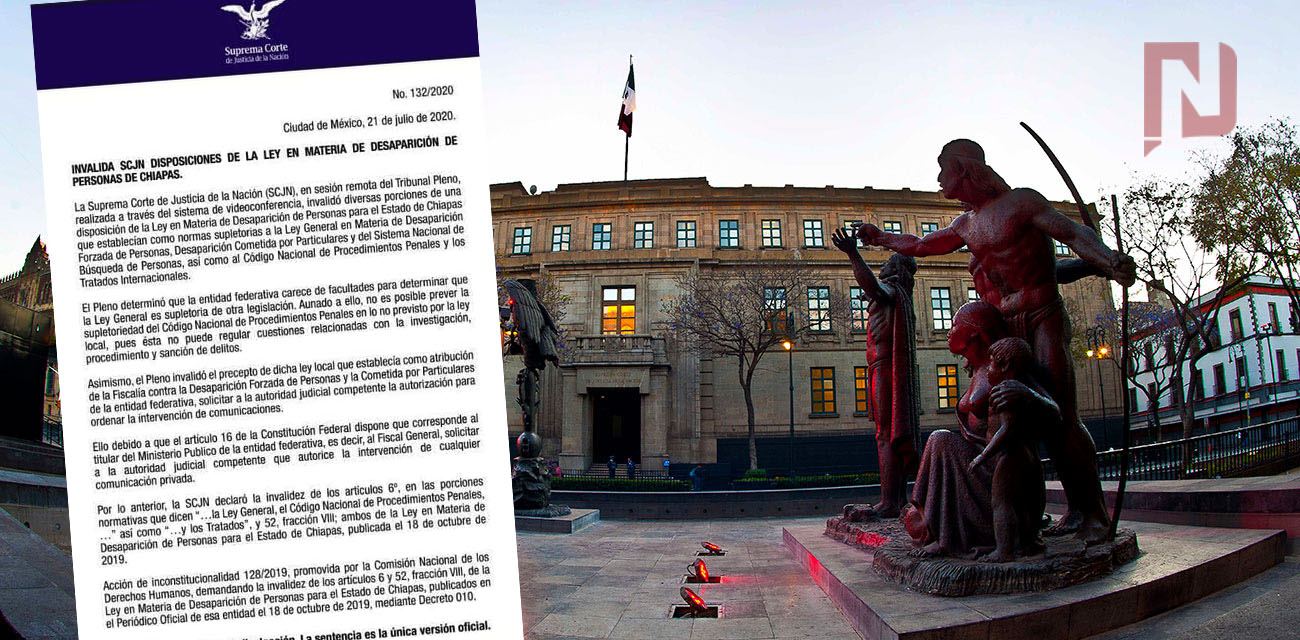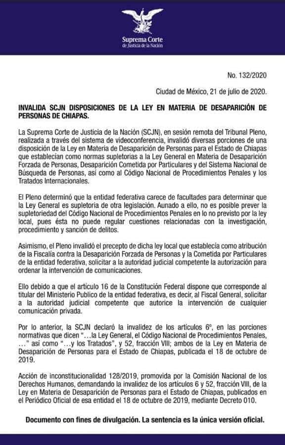La Suprema Corte de Justicia de la Nación (SCJN) invalidó diversas porciones de la Ley en Materia de Desaparición de Personas del estado de Chiapas, debido a que invadían atribuciones de la federación.