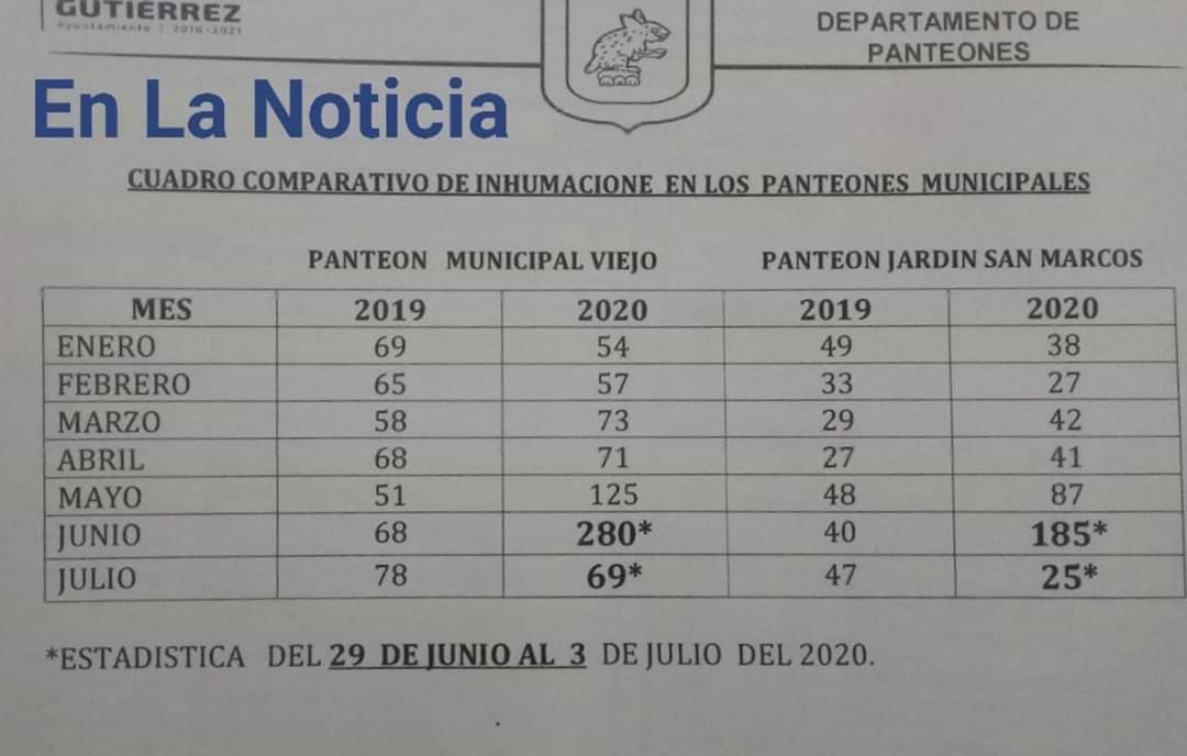 Para el mes de junio el incremento alcanzó un 300 por ciento en comparación con el mismo mes de 2019. El viejo panteón municipal pasó 68 inhumaciones en el 2019 a 280 para este año, mientras que en el Panteón Jardín San Marcos pasó de 40 en 2019 a 185 en 2020.