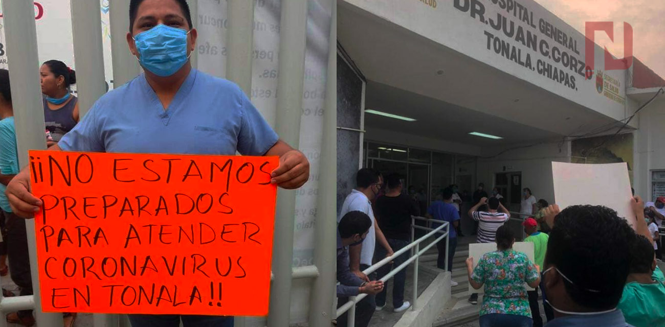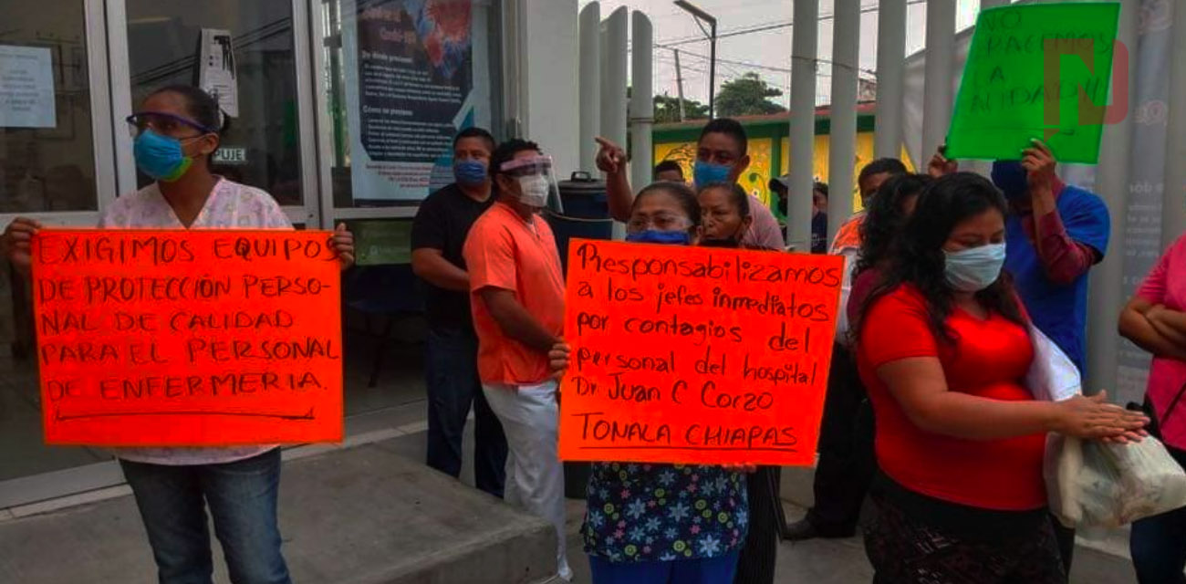 Personal del Hospital General Juan C. Corzo en Tonalá, Chiapas, se manifestaron este miércoles para denunciar la falta de medidas y material de protección para la atención de enfermos de Covid-19 en ese nosocomio de la entidad chiapaneca.