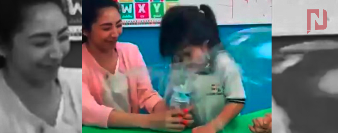 La inocente niña siguió las instrucciones de la docente y acercó la cara a la botella de agua, que estaba llena. Inmediatamente la joven apretó el recipiente de tal forma que un chorro de agua salió expulsado hacia la niña y terminó por empaparla.